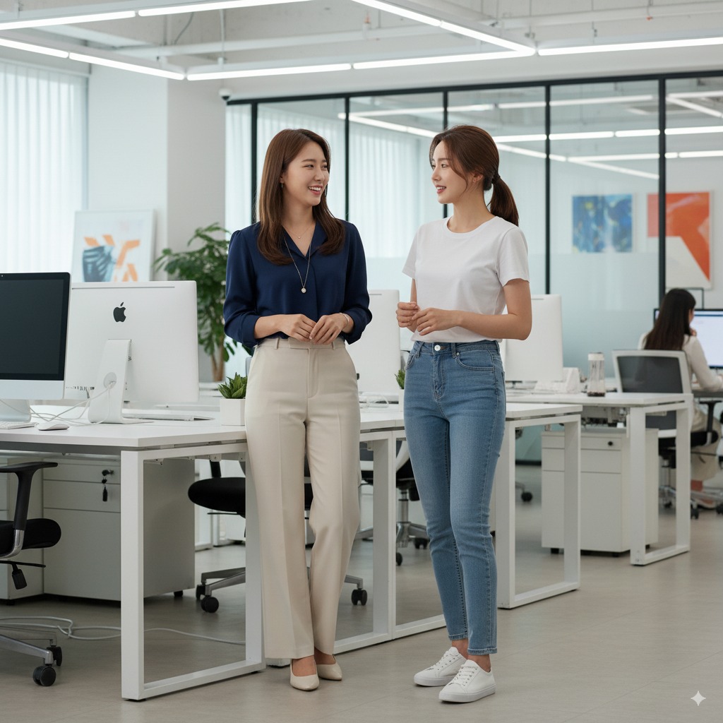 - 프롬프트 : Make the character in this image talking to her friend at a modern office.